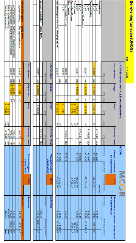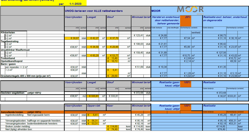 De herstel-, onderhouds-, beheer- en degeneratiekosten voor elementenverhardingen, bermen en gazons zijn berekend volgens de afspraken uit het verleden met de netbeheerders. In bijlage A zijn de tarieven weergegeven voor 2023. Deze tarieven worden voor alle netbeheerders gehanteerd en vastgesteld door de UNOG-gemeenten en zijn marktconform. In de gemeente Zevenaar wordt standaard variant XX met het bijbehorende tarief gehanteerd.