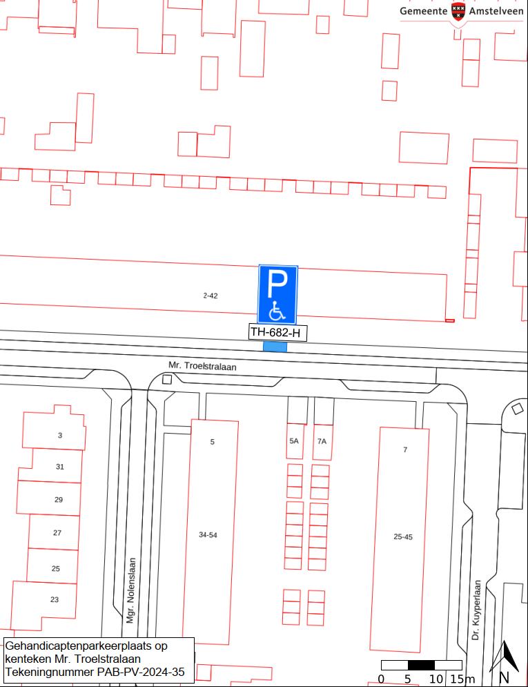 Burgemeester en wethouders van Amstelveen besluiten het parkeren te verbieden op een parkeerplaats in de Mr. Troelstralaan, zoals aangegeven op tekening PAB-PV-2024-35, met uitzondering van het voertuig met het kenteken TH-682-H (gehandicaptenparkeerplaats).