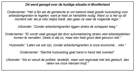 De problematiek van (de huisvesting van) arbeidsmigranten staat ook hoog op de politieke agenda, zowel landelijk als provinciaal en regionaal. Landelijk heeft het Aanjaagteam Bescherming Arbeidsmigranten onder leiding van Emile Roemer haar aanbevelingen uitgebracht, gericht op het verbeteren van hun woon-, werk- en leefomstandigheden. Er wordt daarnaast momenteel gewerkt aan wetgeving die de verantwoordelijkheid van bedrijven bij nieuwe vestiging of uitbreiding om te zorgen voor huisvesting voor hun werknemers juridisch vastlegt. Provinciaal is dit al opgenomen in het coalitieakkoord van Gelderland. Ondernemers in Montferland zijn bereid om deze verantwoordelijkheid te nemen, waarbij het belangrijk is dat de gemeente hen hierin faciliteert.