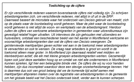 De aantallen arbeidsmigranten worden met behulp van micro-data van het CBS bepaald. Het geeft om verschillende redenen geen volledig en realistisch beeld. Zo schrijven arbeidsmigranten zich niet altijd in of uit bij de gemeente, waardoor het onbekend is hoeveel mensen waar wonen.