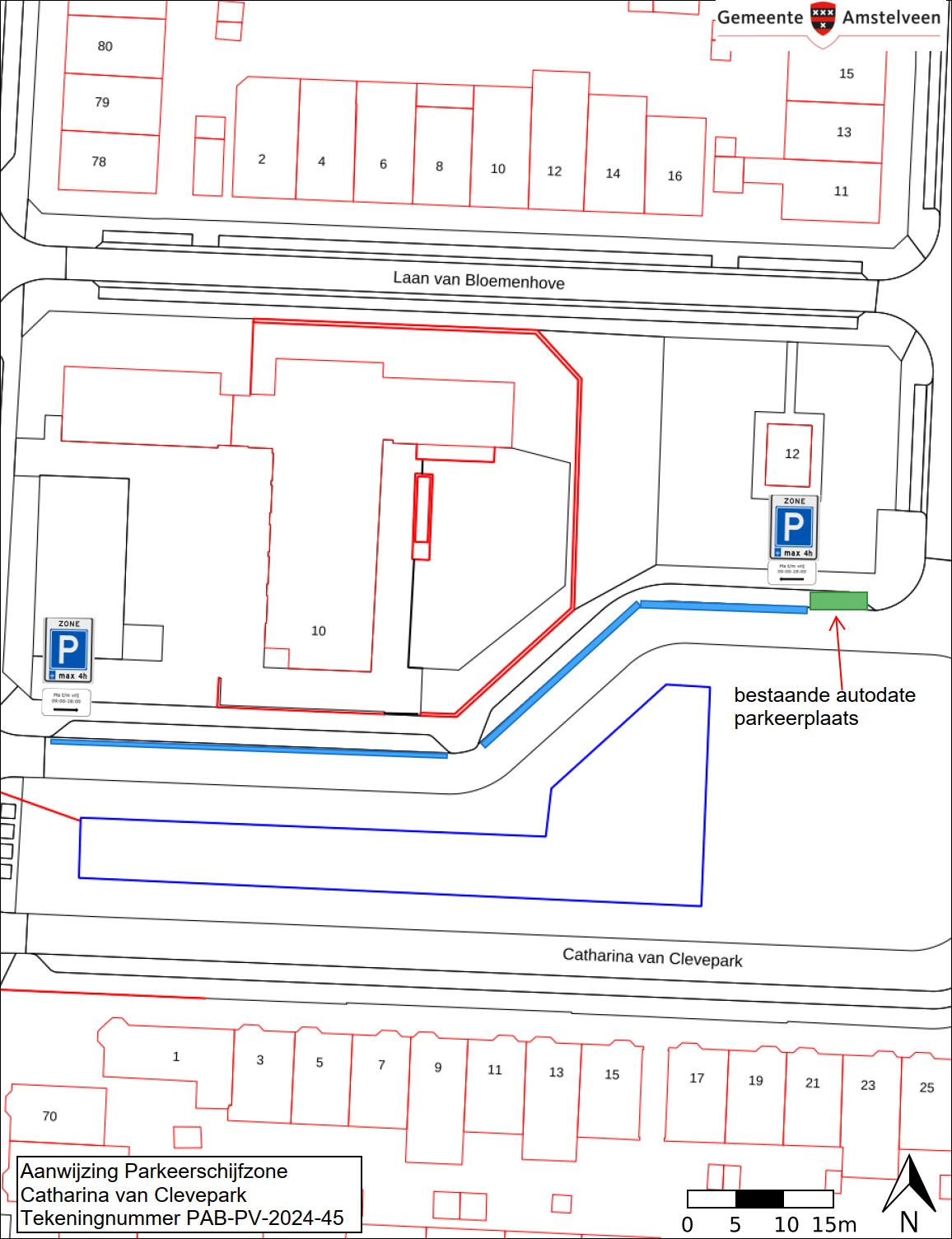 Burgemeester en wethouders van Amstelveen besluiten om de huidige parkeerschijfzone in de straat Catharina van Clevepark, uit te breiden met 7 parkeerplaatsen. De maximale parkeerduur van 4 uur op maandag tot en met vrijdag van 9.00 uur tot 18.00 uur zoals besloten is in het verkeersbesluit op 26 januari 2024 met zaaknummer Z24-008928, blijft ongewijzigd.
