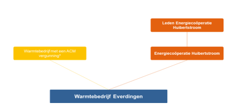 Energiecoöperatie Huibertstroom zal de mogelijkheden onderzoeken om een warmtebedrijf op te richten volgens een coöperatieve organisatievorm, dit is het Warmtebedrijf Everdingen. Dit warmtebedrijf zal warmte leveren aan de inwoners in de kern van Everdingen en moet beschikken over een vergunning van de Autoriteit Consument & Markt (ACM). De wijze waarop aan de ACM-verplichtingen zal worden voldaan zal uitgezocht worden in een volgende fase. Energiecoöperatie Huibertstroom heeft aangegeven dat ze nu niet voldoet aan de vereisten om zelfstandig een vergunning aan te vragen. Daarom wordt een samenwerking onderzocht met een warmtebedrijf dat al een ACM-vergunning heeft. Het Warmtebedrijf Everdingen zal aansluit- en leveringsovereenkomsten aangaan met de inwoners van Everdingen.