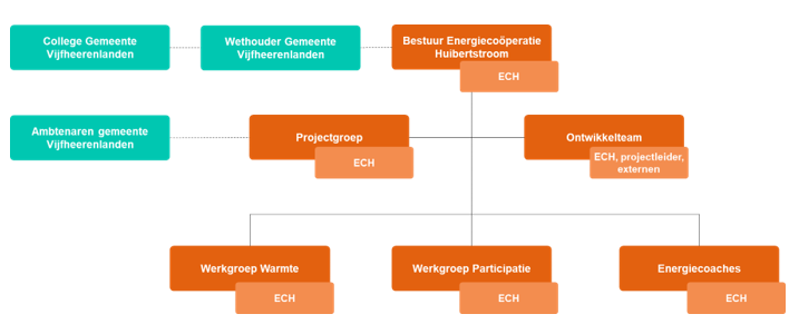 De interne projectorganisatiestructuur is zo opgezet dat Energiecoöperatie Huibertstroom eigenaar is van de resultaten, en ook het gezicht naar buiten is voor de bewoners en de stakeholders. Op deze manier is er continuïteit voor vervolgwerkzaamheden.