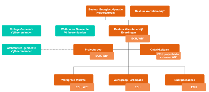 Op het moment dat een warmtebedrijf met een ACM-vergunning zich aansluit bij dit project wordt de volgende interne projectorganisatiestructuur voorzien, waarbij het warmtebedrijf met een ACM-vergunning (WB in onderstaande figuur 5.4) aansluit bij het Warmtebedrijf Everdingen. Daarnaast zal de projectgroep de bestuursoverleggen voorbereiden voor het bestuur van het Warmtebedrijf Everdingen en de aandeelhouders.