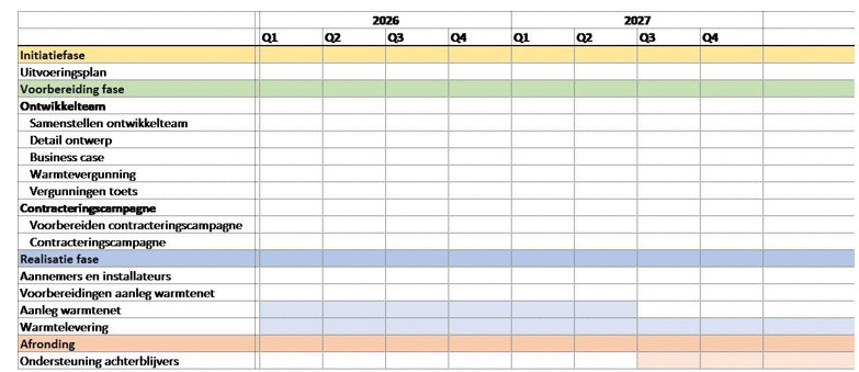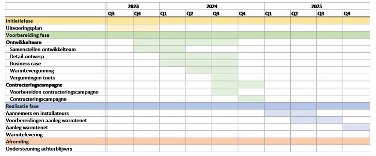 Figuur 6.1 toont de planning om Everdingen aardgasvrij te maken. Deze start bij het vaststellen van het uitvoeringsplan. In de volgende fase zal aandacht besteed worden aan het ontwikkelen van een aanbod richting inwoners, ondernemers en gebouweigenaren in Everdingen en het ophalen van (intentie-)aansluit- en leveringsovereenkomsten. In de realisatiefase worden aannemers en huisinstallateurs gezocht voor alle werkzaamheden ten behoeve van het aanleggen van het warmtenet en het aansluiten van gebouwen. Na een definitieve investeringsbeslissing (FID) start de daadwerkelijke aanleg van het warmtenet en het aansluiten van gebouwen. Nadat alle gecontracteerde inwoners en ondernemers van warmte worden voorzien start de ondersteuning van achterblijvers om op termijn ook aan te sluiten op het warmtenet.