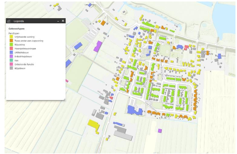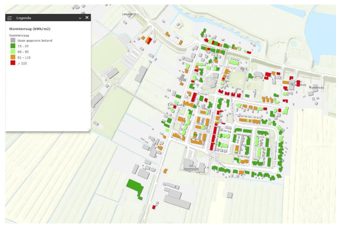 Op basis van verbruiksgegevens van de netbeheerder en gegevens uit het Basisregistratie Adressen en Gebouwen is de warmtevraag van de woningen in Everdingen berekend. De warmtevraag wordt weergegeven in kWh/m2, vergelijkbaar met een modern energielabel. Door de warmtevraag te delen door de oppervlakte van de woning, krijgen we een indicatie van de isolatiegraad. Ongeveer de helft van de woningen (groen weergegeven) heeft een goede isolatie, terwijl de rest wat minder goed geïsoleerd is. Om de woningen comfortabel te kunnen verwarmen met het beoogde warmtesysteem, is het wenselijk dat de warmtevraag lager is dan ongeveer 80 kWh/m2.