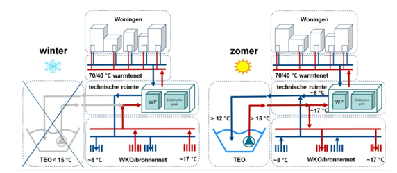 TEO-systeem (blauw): de warmtebron is energie uit oppervlaktewater. De warmte wordt in de zomer onttrokken uit het oppervlaktewater. Het TEO-systeem bestaat onder andere uit een inlaat, een uitlaat, leidingwerk, pompen, filters, warmtewisselaars en regelkasten. In de afbeelding zijn indicatieve in/uitlaatlocaties weergegeven. Voor de componenten van het TEO-systeem in de TR (technische ruimte) is een minimale ruimte van enkele tientallen vierkante meters benodigd.