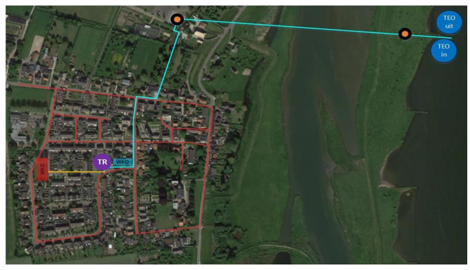 WKO-zoekgebieden (rood en blauw): het opslagsysteem is een WKO-systeem. De warmte uit het oppervlaktewater wordt in de zomer opgeslagen in de bodem. In de winter wordt deze warmte gebruikt om de gebouwen te verwarmen. Via de leidingen (geel) wordt het water naar de TR gedistribueerd. In de afbeelding zijn twee zoeklocaties weergegeven, voor respectievelijk een koude en een warme bron. De benodigde afstand tussen de warme bron en koude bron is circa 200 meter.