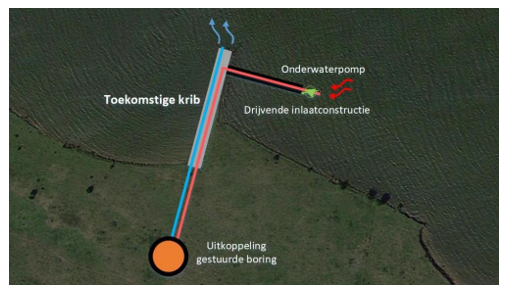 Rijkswaterstaat is bevoegd gezag over de Lek. Energiecoöperatie Huibertstroom en Rijkswaterstaat zijn in gesprek over de mogelijkheden voor het onttrekken van warmte aan de Lek. Rijkswaterstaat heeft Energiecoöperatie Huibertstroom ondersteund bij de ontwikkeling van de krib (zie figuur 4.3). Energiecoöperatie Huibertstroom is betrokken bij de financiële werkgroep project ‘Warmte uit Water’. Daarnaast maakt Energiecoöperatie Huibertstroom deel uit van het leerteam binnen RWS waaruit zo nodig kennis en kunde ingeschakeld kan worden. Daarnaast is er de mogelijkheid om hieruit onderzoeksvragen op te stellen waarna het leerteam hier een plan voor opstelt en financiële middelen gaat zoeken voor de uitvoering.