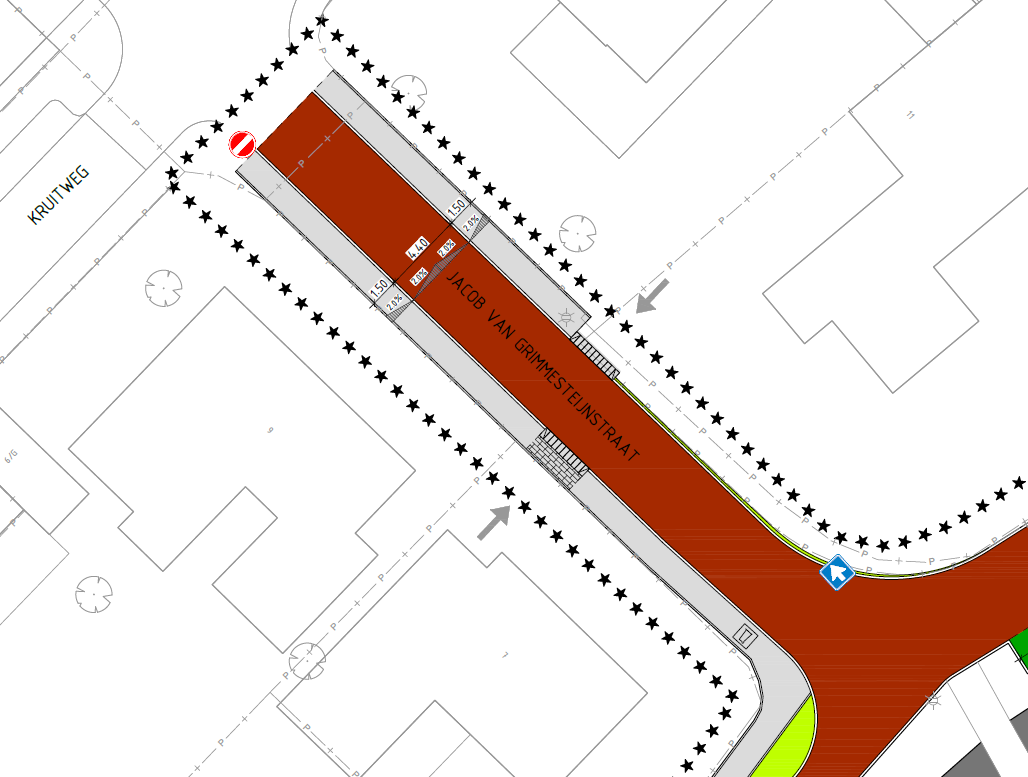 dat de rijbaan van de Jacob van Grimmesteijnstraat 4.40m breed is en daarmee niet voldoet aan de minimale breedte voor twee richting verkeer conform de ASVV;