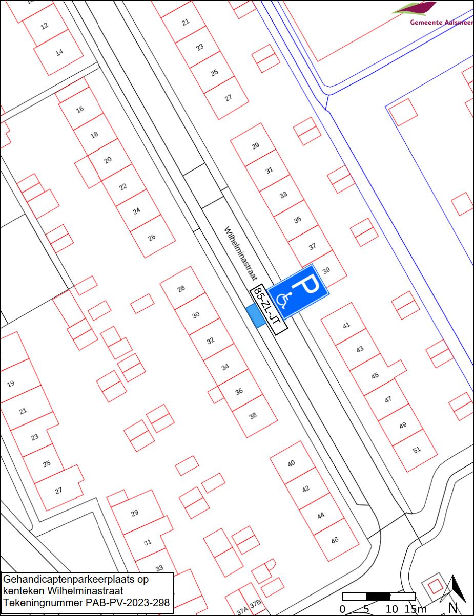 Burgemeester en wethouders van Aalsmeer besluiten het parkeren te verbieden op een parkeerplaats Wilhelminastraat, zoals aangegeven op tekening PAB-PV-2023-298, met uitzondering van het voertuig met het kenteken 85-ZL-JT (gehandicaptenparkeerplaats).