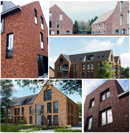 Het appartementengebouw is opgedeeld in twee geschakelde en verspringende volumes. Door de opdeling van de volumes voegt het gebouw zich in de korrelgrootte van de bestaande bebouwing in het lint. In zijn materialisering past het gebouw goed binnen de bebouwing aan het lint. De bestaande woningen zijn veelal in rood/bruin baksteen gebouwd en hebben een pannendak. De architectuur en detaillering daarintegen is eigentijds, waardoor het goed zichtbaar wordt dat het hier om een nieuwe toevoeging gaat. Het gebouw vormt samen met de middeldure huur/koop appartementen een familie in architectuur en detaillering.