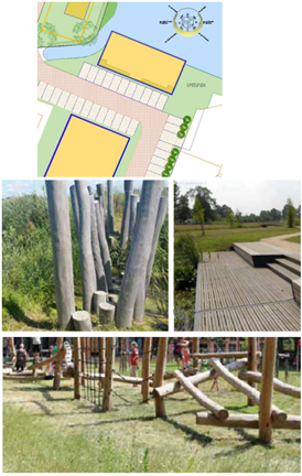 De openbare ruimte zal worden ingericht met hoogwaardige materialen. Speelplek De speelplek is gesitueerd nabij het sociale huurappartementengebouw. De openbare speelplek is tevens de looproute voor naar het verenigingsgebouw van de ijsvereniging. De speelplek zal worden ingericht met natuurlijke materialen en speelvoorzieningen.