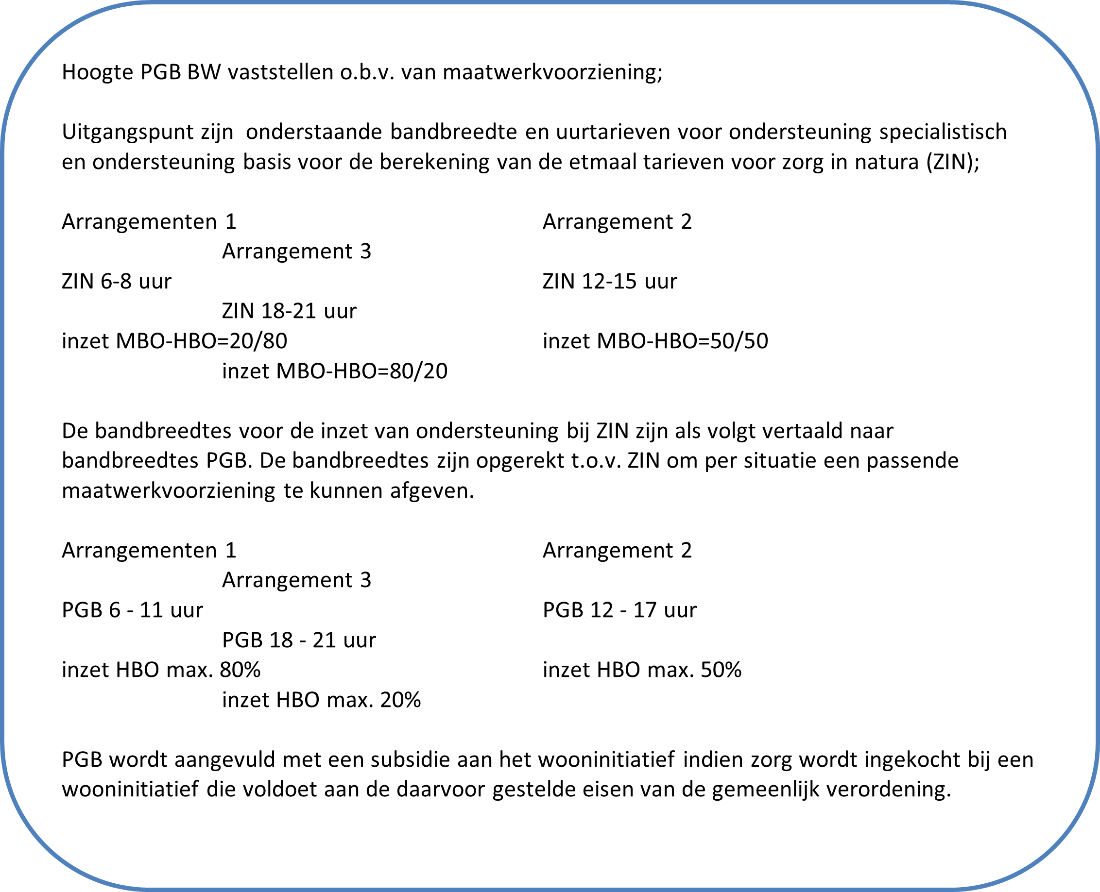 Het geïndiceerde arrangement is richtinggevend voor het aantal uren begeleiding. Er wordt dan beschikt op basis van een basis 4 uur MBO voor de collectieve uren, aangevuld/verrekend met de individuele zorgvraag van de cliënt, vastgesteld in aantal uren verdeeld naar ondersteuningsuren voor begeleiding basis (MBO) en begeleiding specialistische (HBO), eventueel aangevuld met een subsidie aan het wooninitiatief om de collectieve component in te kunnen kopen.
