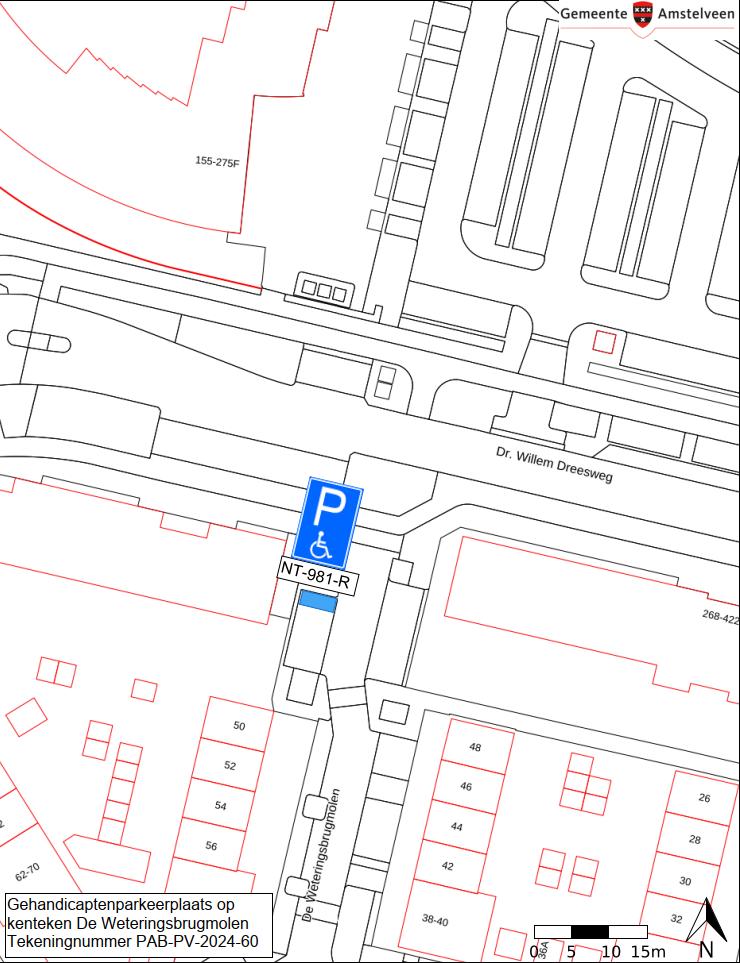 Burgemeester en wethouders van Amstelveen besluiten het parkeren te verbieden op een parkeerplaats in De Weteringsbrugmolen, zoals aangegeven op tekening PAB-PV-2024-60, met uitzondering van het voertuig met het kenteken NT-981-R (gehandicaptenparkeerplaats).