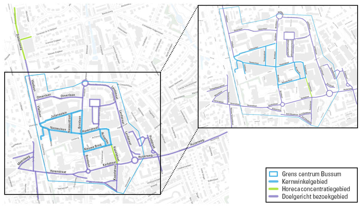Het kernwinkelgebied van Bussum bestaat uit de Nassaulaan, Nassaustraat, Julianaplein, Veerstraat, Veerplein, Nieuwe Brink en een deel van de Brinklaan en Havenstraat. In dit gebied staat recreatief winkelen en ‘kijken en vergelijken’ centraal. Consumenten uit Gooise meren en de regio kunnen hier terecht voor funshoppen evenals specialistisch aanbod en dagelijkse boodschappen. De winkelmix wordt aangevuld met diverse diensten en (dag)horeca, die de verblijfskwaliteit van het centrumbezoek versterken. Transformatie naar wonen in de plint is niet toegestaan.