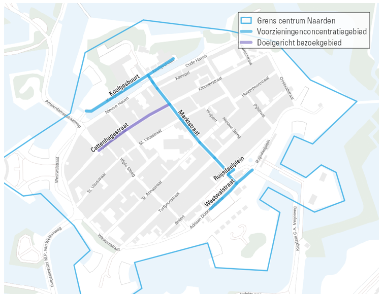 Het centrum van Naarden is opgebouwd volgens het zogenoemde “Haltermodel”. De Marktstraat vormt hierin de belangrijkste commerciële ader van de vestingstad. Maar, ook aan de uiteinden van het Haltermodel zijn in en nabij de vestingmuren enclaves van commerciële voorzieningen aanwezig. Deze structuur willen we behouden en waar mogelijk versterken. Wonen in dit gebied (blauw aangegeven op de kaart) willen we dan ook zoveel als mogelijk beperken. Het accent ligt hier op een mix van commerciële voorzieningen als detailhandel, horeca, kantoorfuncties, diensten en ambachten.