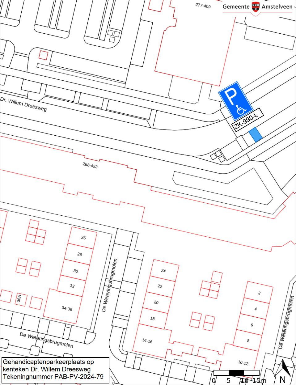 Burgemeester en wethouders van Amstelveen besluiten het parkeren te verbieden op een parkeerplaats aan de Dr. Willem Dreesweg, zoals aangegeven op tekening PAB-PV-2024-79, met uitzondering van het voertuig met het kenteken ZK-990-L (gehandicaptenparkeerplaats).
