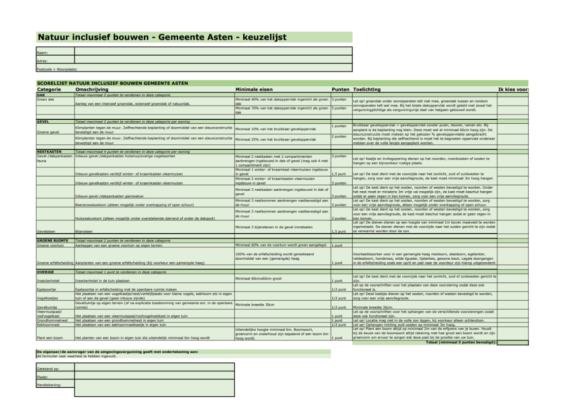 Natuurinclusief bouwen wordt een verplichting bij nieuwbouw van woningen en gebouwen in de gemeente Asten. In Asten is gekozen voor een vorm waarbij er vrijheid voor initiatiefnemers is om zelf te kijken welke maatregelen voor hun initiatief passend zijn. We leggen deze verplichting op bij initiatieven vanaf 5 wooneenheden/ bedrijven en bij bouwaanvragen van gebouwen die een maatschappelijke functie krijgen. Het model dat we in Asten hanteren is uitgewerkt in een tabel met maatregelen en bijbehorende punten die je krijgt per maatregelen. Maatregelen zijn bijvoorbeeld de aanleg van een groen dak, gevelgroen, ingemetselde nest- en verblijfplaatsen, maar ook een groene voortuin of het planten van een boom in de tuin. Voor particuliere woningen/bedrijven geldt dat per wooneenheid/bedrijf 5 punten behaald moeten worden. Deze verplichting wordt opgenomen in de anterieure overeenkomst en/of het omgevingsplan. Bij grotere maatschappelijke gebouwen zoals een gemeenschapshuis, scholen, zorginstelling etc. hanteren we ook een minimum van 5 punten. Echter dienen zij, indien gekozen wordt voor een maatregel uit de categorie ‘Nestkasten’ 3 maal de minimale eis te realiseren om hetzelfde aantal punten te behalen. We gaan er daarbij vanuit dat deze gebouwen vaak ook een stuk groter zijn. Indien dit niet het geval is kan hiervan worden afgeweken en hetzelfde aantal worden gehanteerd als bij een particuliere woning/bedrijf. Bij alle andere afwijkende gevallen leggen we een verplichting op in dezelfde lijn als hierboven beschreven die passend is bij de betreffende aanvraag. Zeker bij gemeentelijke gebouwen geven we daarbij het goede voorbeeld. Bij de vergunningaanvraag dient de initiatiefnemer aan te geven welke maatregelen hij toe zal passen. De tabel met maatregelen en bijbehorende punten is toegevoegd in bijlage 5. De puntentabel is een dynamisch stuk wat we in de komende jaren op basis van ervaringen en nieuwe ontwikkelingen op accenten aanpassen indien nodig.