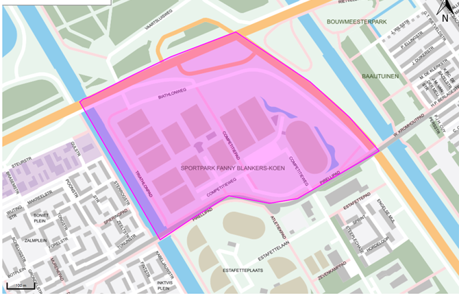 Het gebied, de directe omgeving van het stadion van Almere City FC, aangegeven op bijlage I van dit besluit en dat wordt omsloten/begrensd door de wegen Hogering (noord), Tussenring (oost), Pirellipad (zuid) en het water Hoge Vaart (west), aan te wijzen als gebied waar camera’s worden geplaatst voor de periode 1 juli 2024 tot 1 juli 2025 ten behoeve van de handhaving van de openbare orde;