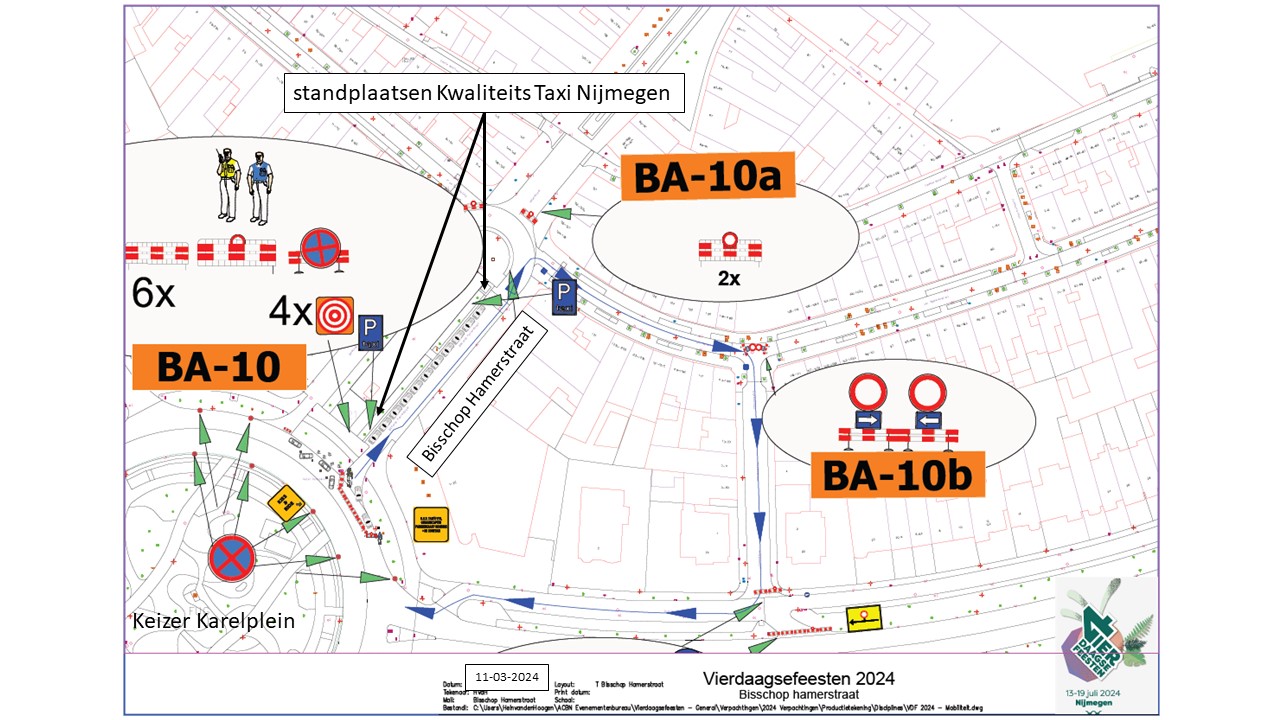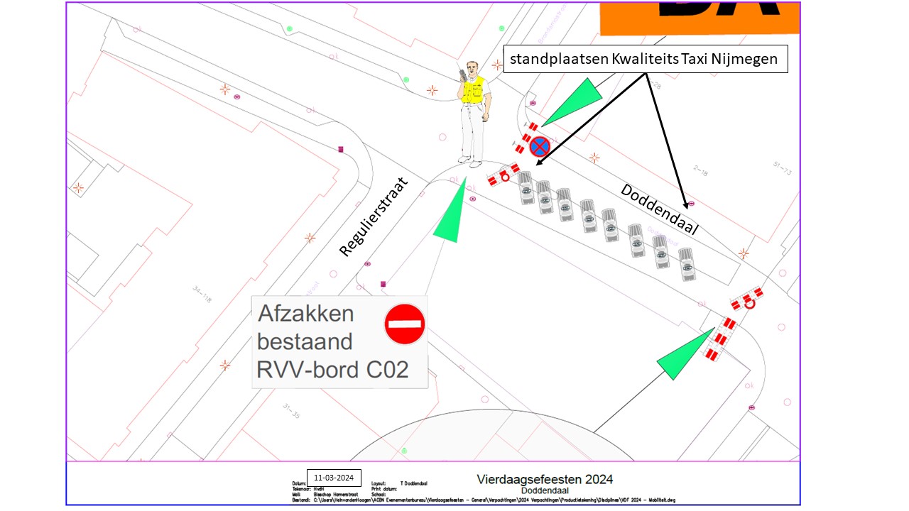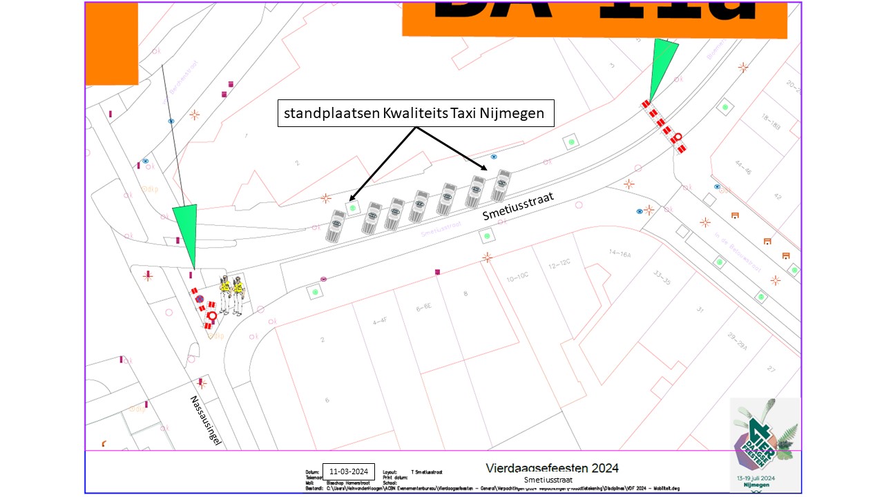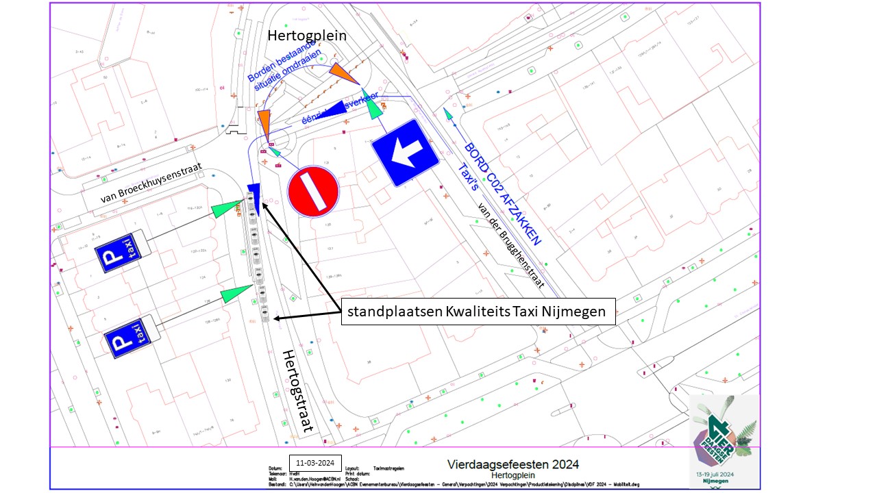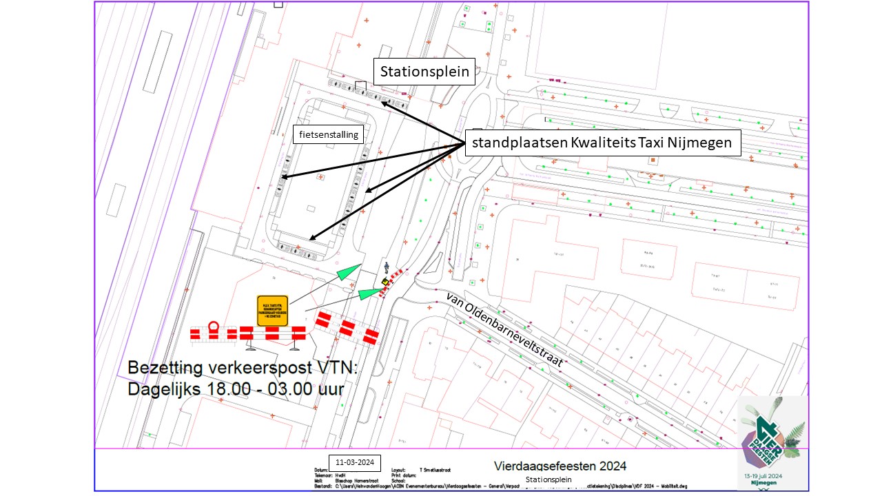 Verkeersbesluit voor tijdelijke standplaatsen voor Kwaliteits Taxi Nijmegen tijdens de Nijmeegse Vierdaagsefeesten 2024 aan Bisschop Hamerstraat, Stationsplein, Smetiusstraat, Doddendaal en Hertogstraat te Nijmegen