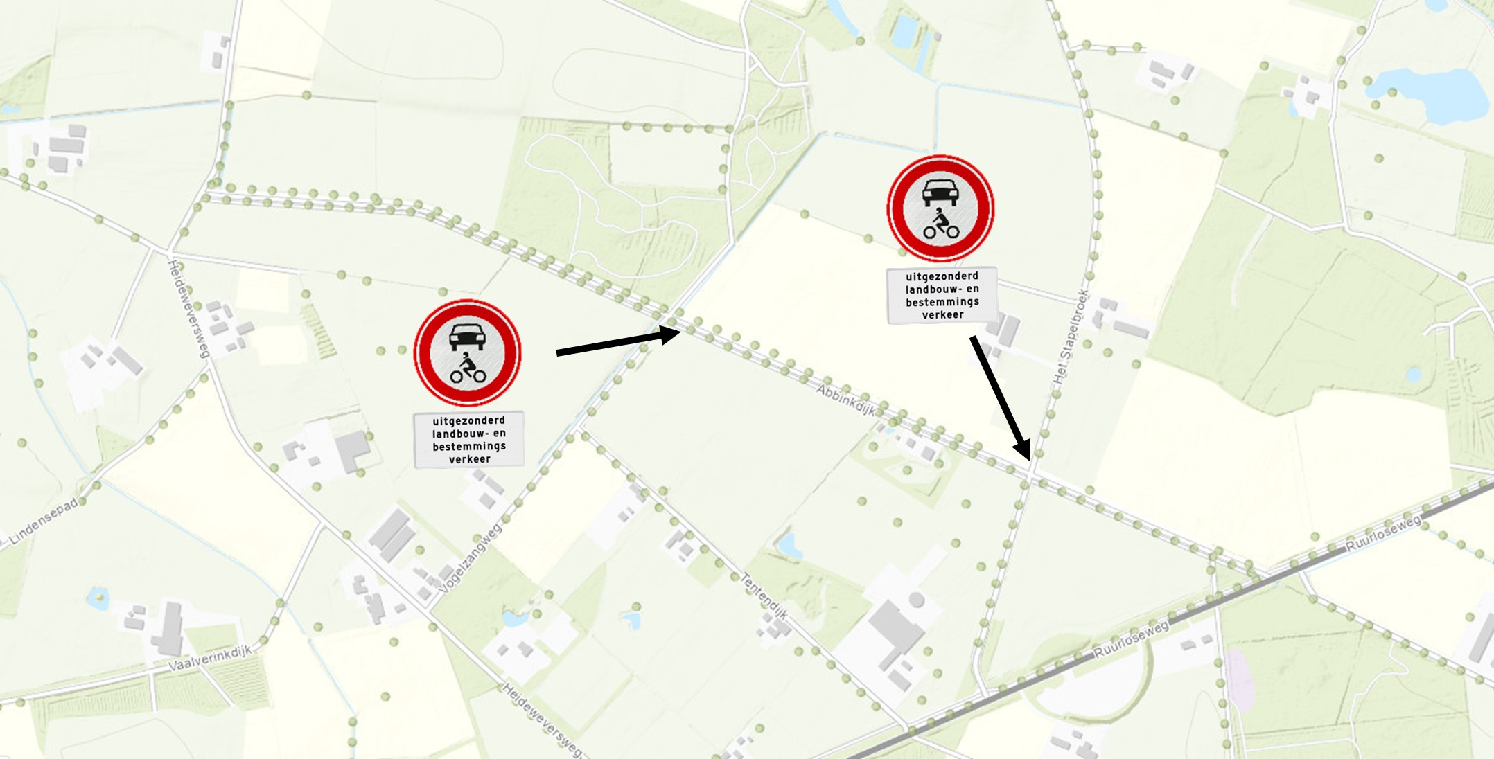 Het aanbrengen van het bord C12 (gesloten voor motorvoertuigen) met onderbord ‘met uitzondering van landbouw- en bestemmingsverkeer’ op de onderstaande kruispunten: