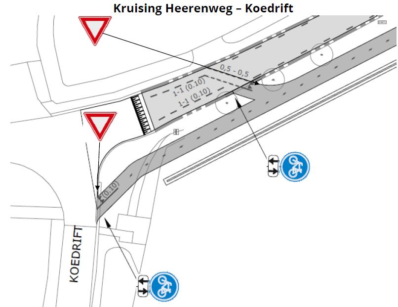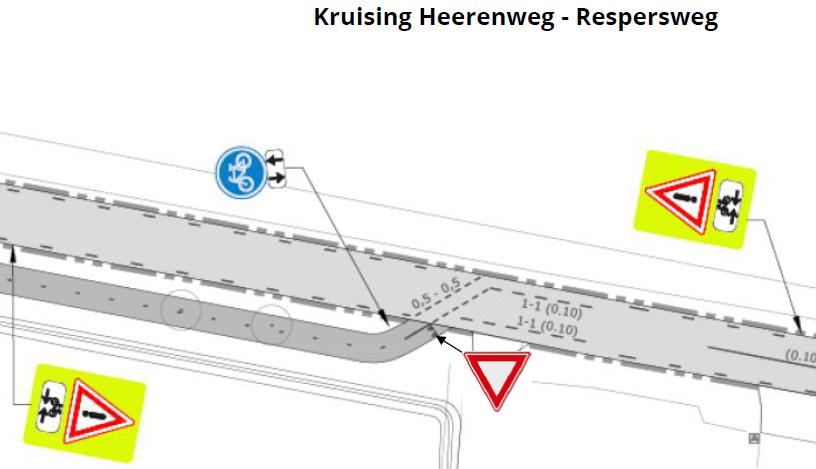 Door het plaatsen van verkeersbord B06 conform bijlage 1 van het RVV 1990 in combinatie met haaientanden, zoals gesteld in artikel 80 RVV 1990, bij het begin en het einde van het vrij liggende fietspad nabij de kruisingen Koedrift/ Heerenweg en Respersweg/ Heerenweg