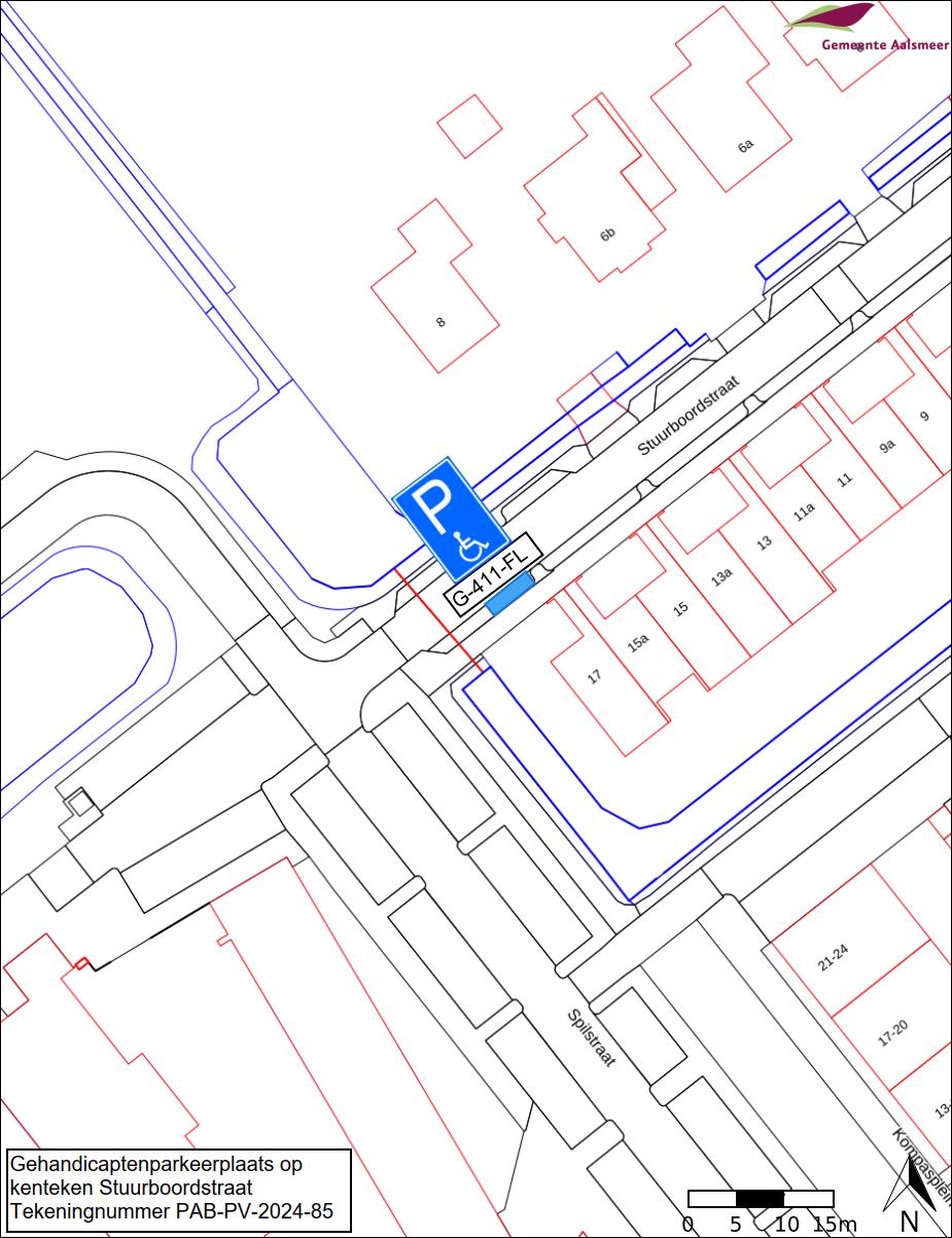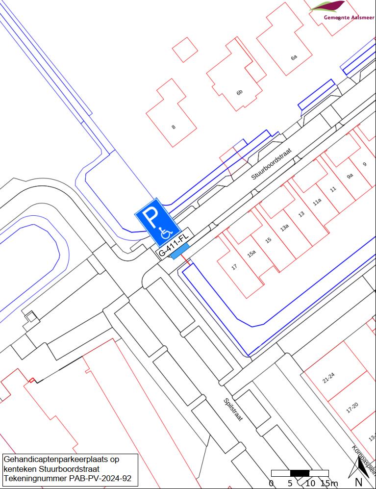 Burgemeester en wethouders van Aalsmeer besluiten om in de Stuurboordstraat, de locatie van de gereserveerde gehandicaptenparkeerplaats op kenteken G-411-FL, te wijzigen. De huidige locatie van de gehandicaptenparkeerplaats is weergegeven op de in dit besluit opgenomen tekening PAB-PV-2024-85. De juiste locatie van de gehandicaptenparkeerplaats is weergegeven op de in dit besluit opgenomen tekening PAB-PV-2024-92.