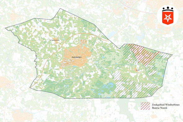 In het Haalbaarheidsonderzoek windenergie (Bosch & van Rijn, 7 maart 2023) zijn in maart 2023 voor de gemeente Haaksbergen de ruimtelijke mogelijkheden voor grootschalige windturbines in de gemeente Haaksbergen verkennend in beeld gebracht. Dit resulteerde in twee zoekgebieden: ‘Buurse Noord’ en ‘Buurse Zuid’. Zoekgebied ‘Buurse Noord’ bestaat uit een aaneengesloten gebied, terwijl zoekgebied ‘Buurse Zuid’ meer versnipperd is (zie figuur 2).