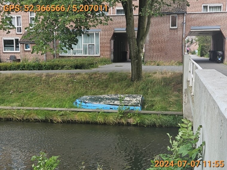 Op het gras op de Alkmaargracht ter hoogte van huisnummer 142 te Almere is een blauw gekleurd vaartuig geplaatst in strijd met het bepaalde in artikel 2:6 van de Algemene Plaatselijke Verordening (APV 2011)