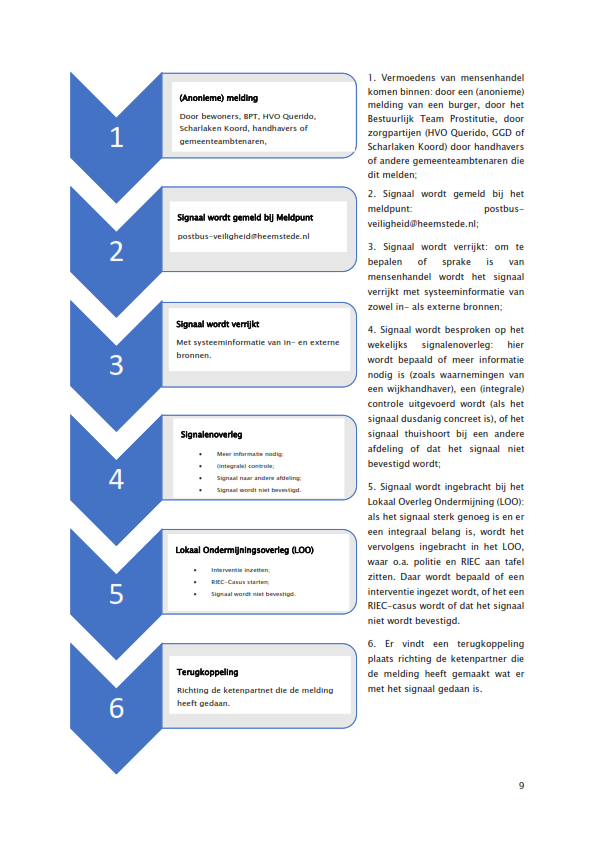 In Heemstede ligt de beleidsmatige aanpak van mensenhandel verankerd in het Actieplan Integrale Veiligheid 2020-2023. Mensenhandel is daarin benoemd als thema onder de geprioriteerde aanpak van ondermijnende criminaliteit. Dit zal tevens opgenomen worden in het Integraal Veiligheidsplan 2024-2027 dat in Q3 2024 naar de raad zal gaan.