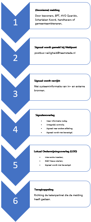 Signaal wordt ingebracht bij het Lokaal Overleg Ondermijning (LOO): als het signaal sterk genoeg is en er een integraal belang is, wordt het vervolgens ingebracht in het LOO, waar o.a. politie en RIEC aan tafel zitten. Daar wordt bepaald of een interventie ingezet wordt, of het een RIEC-casus wordt of dat het signaal niet wordt bevestigd.