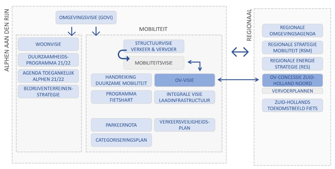 Deze OV-visie is onderdeel van ons bredere mobiliteitsbeleid en kent daarmee raakvlakken met gemeentelijk, regionaal en landelijk beleid (zie Figuur 1). Deze OV-visie zal onderdeel uitmaken van de nog te ontwikkelen Mobiliteitsvisie 2040 voor Alphen aan den Rijn, die op haar beurt zal worden gebaseerd op de hoofdlijnennotitie van de nog op te stellen mobiliteitsvisie 2050 van het Rijk. Daarnaast kent deze visie tevens samenhang met het regionale mobiliteitsbeleid en specifiek de OV-concessie Zuid-Holland Noord.