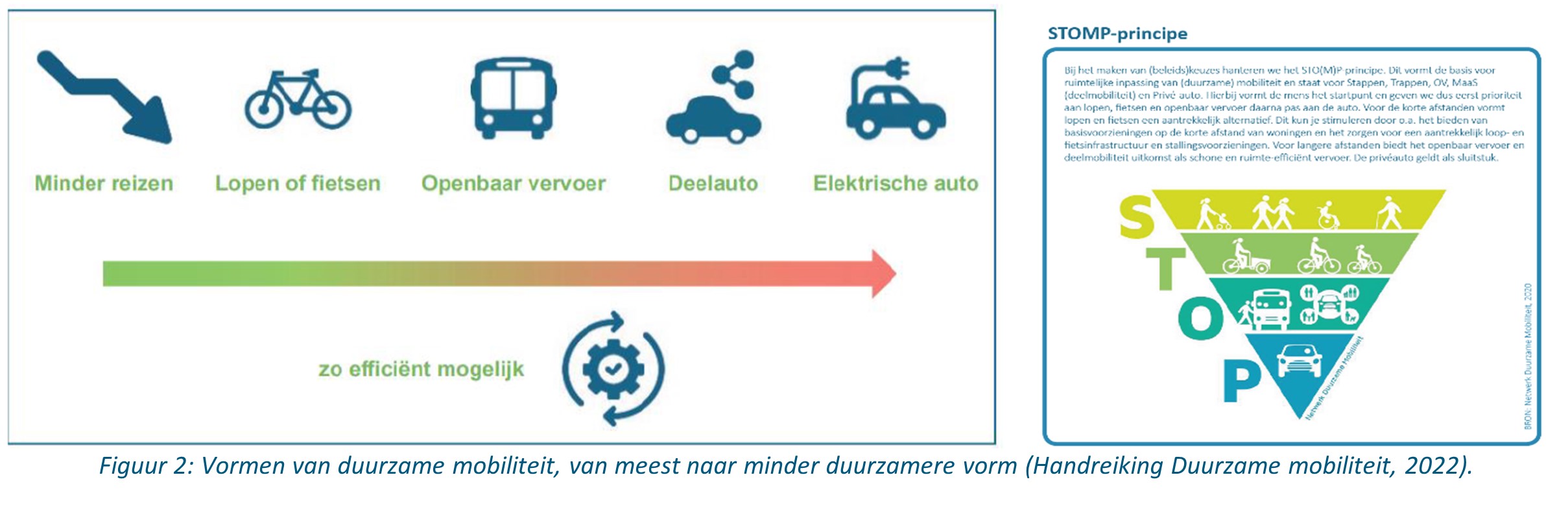 Duurzame mobiliteit is voor verschillende modaliteiten verder uitgewerkt in de Handreiking Duurzame mobiliteit (2022), waarin het STOMP-principe wordt gehanteerd om keuzes te kunnen maken bij ruimtelijke ontwikkelingen. Goed openbaar vervoer wordt daarbij beschouwd als een goed OV-netwerk (vertakkingen in woongebieden en relevante bestemmingen om snel een halte te kunnen bereiken) waarbij de frequentie van de dienstregeling voldoende is afgestemd op de behoefte van de gebruikers. Op vervoersknopen is daarbij een goede verbinding met andere modaliteiten nodig, zoals de fiets, de auto maar ook voor de voetganger. Duurzame mobiliteit draagt tevens bij aan de ambities voor energietransitie en klimaatadaptatie en het doel om in 2050 CO2-neutraal te zijn (GOVI, 2022).
