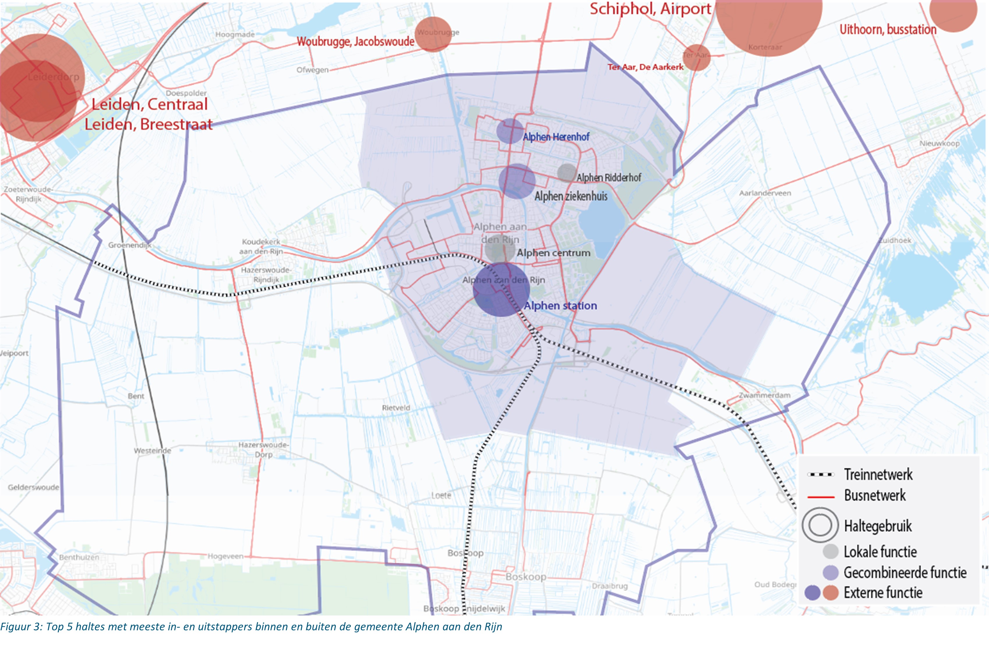 De kaart op de volgende pagina geeft de Top 5 haltes met meeste in- en uitstappers binnen en buiten Alphen weer.