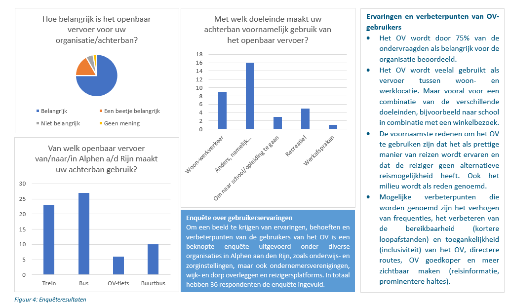 Het openbaar vervoer (OV) vervult een belangrijke rol als vervoermiddel binnen Alphen aan den Rijn en voor verplaatsingen van en naar de kern. Als onderdeel van de Belevingspeiling 2023 (een brede peiling onder inwoners over diverse onderwerpen) zijn inwoners gevraagd naar hun tevredenheid over het OV, zie onderstaand kader. Daarnaast is voor deze OV-visie een (aparte) enquête uitgezet onder enkele organisaties.