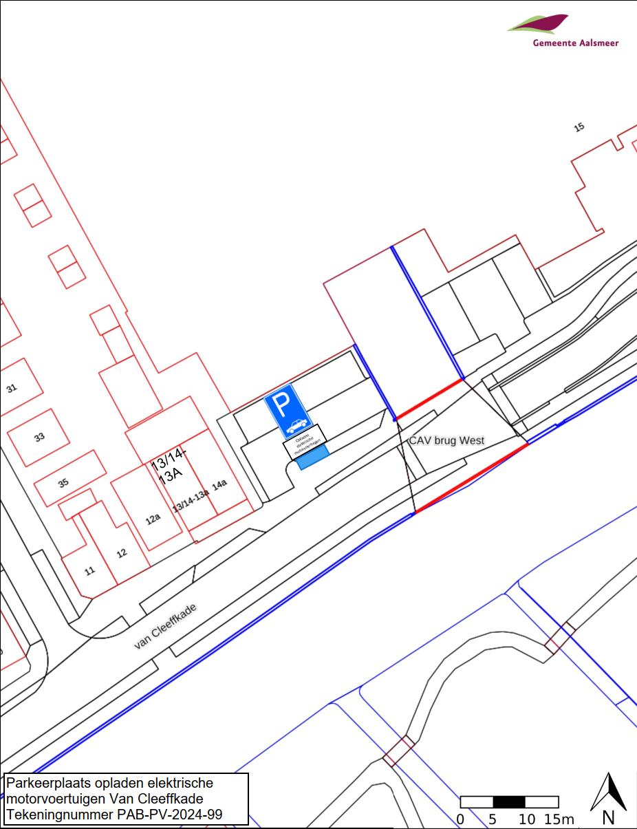 Burgemeester en wethouders van Aalsmeer besluiten om aan de Van Cleeffkade, de locatie van de gereserveerde parkeerplaats voor het opladen van elektrische motorvoertuigen, te wijzigen. De huidige locatie van de gereserveerde parkeerplaats is weergegeven op de in dit besluit opgenomen tekening PAB-PV-2023-197. De openbare laadpaal is nog niet geplaatst waardoor in de praktijk niets veranderd. De nieuwe locatie van de gereserveerde parkeerplaats voor het opladen van elektrische motorvoertuigen is weergegeven op de in dit besluit opgenomen tekening PAB-PV-2024-99