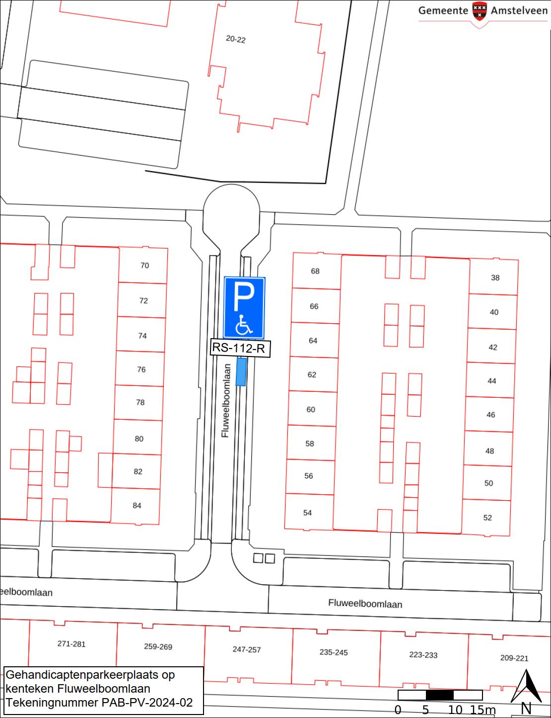 Burgemeester en wethouders van Amstelveen besluiten het parkeren te verbieden op een parkeerplaats in de Fluweelboomlaan, zoals aangegeven op tekening PAB-PV-2024-02, met uitzondering van het voertuig met het kenteken RS-112-R (gehandicaptenparkeerplaats).