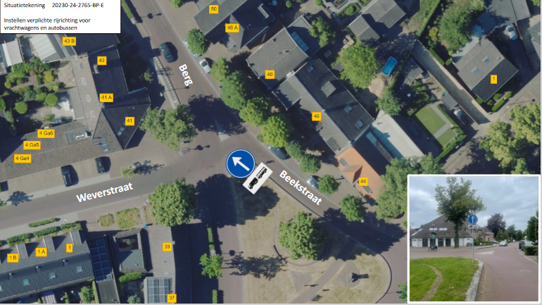 Gelet op de verkeersveiligheid van het verkeer op de kruising, het beperken van het risico aan schade aan voertuigen en het verbeteren van de leefbaarheid is het daarom gewenst om een verplichte rijrichting voor autobussen en vrachtauto’s in te stellen in de Berg ter hoogte van de aansluiting op de Weverstraat en ter hoogte van huisnummers 46-48;