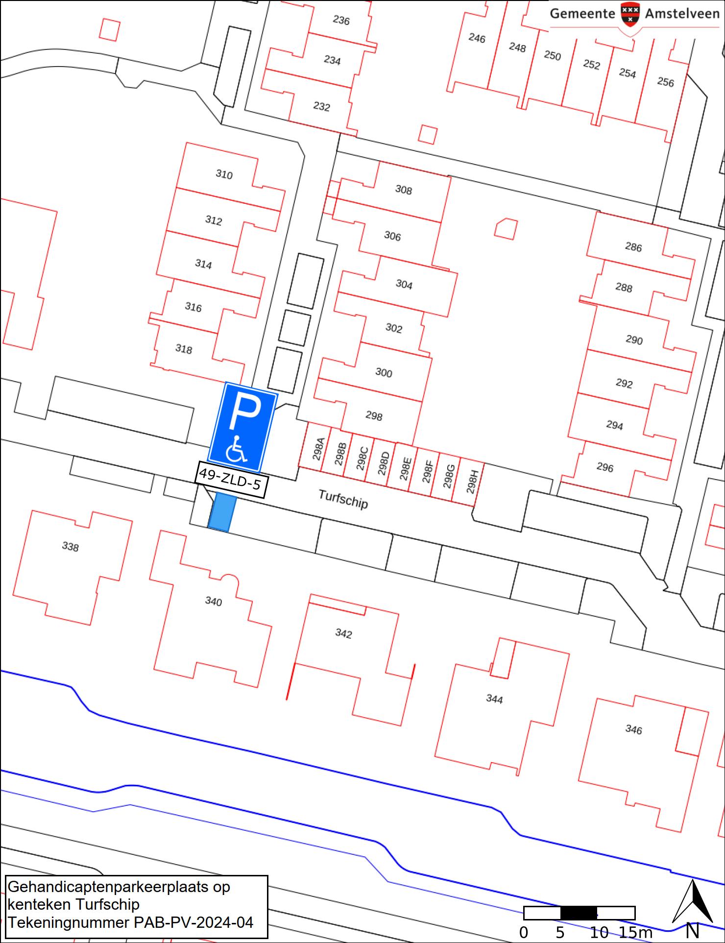 Burgemeester en wethouders van Amstelveen besluiten het parkeren te verbieden op een parkeerplaats in de straat Turfschip, zoals aangegeven op tekening PAB-PV-2024-04, met uitzondering van het voertuig met het kenteken 49-ZLD-5 (gehandicaptenparkeerplaats).