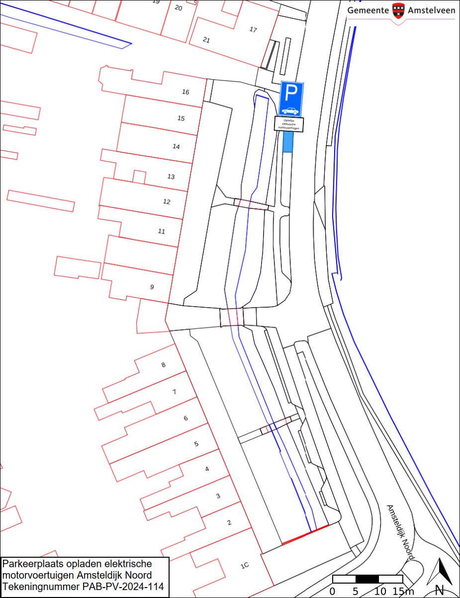 Burgemeester en wethouders van Amstelveen besluiten om in de straat Amsteldijk Noord één parkeerplaats aan te wijzen als parkeerplaats voor het opladen van elektrische motorvoertuigen. De parkeerplaats mag alleen gebruikt worden voor het opladen van deze elektrische motorvoertuigen.