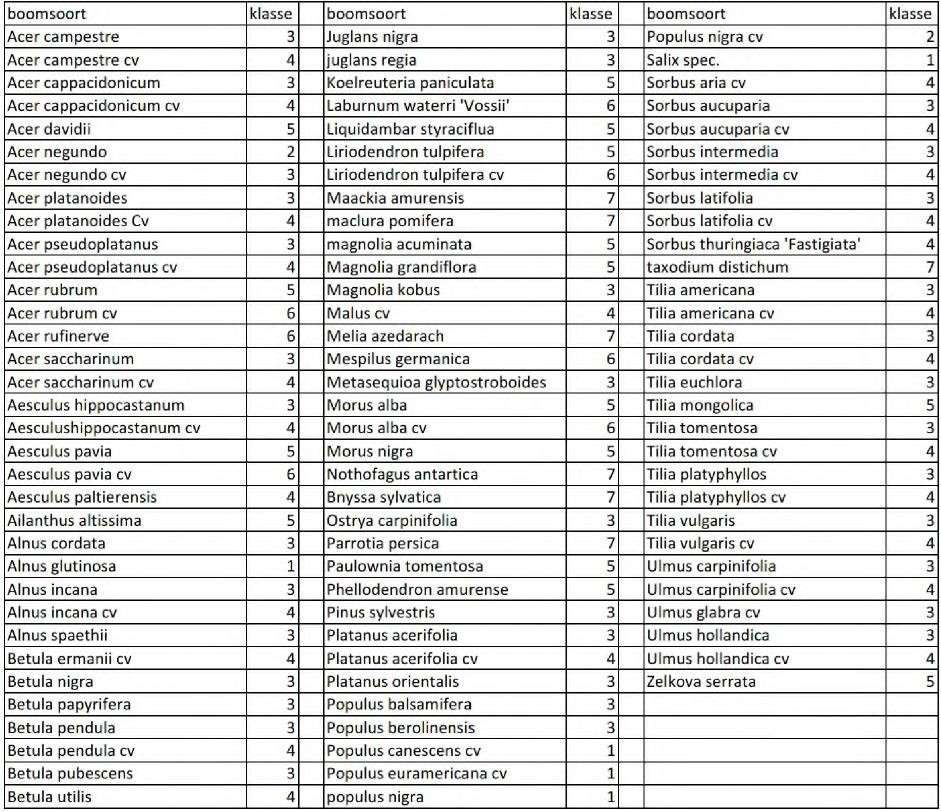 Als de boom niet in de lijst voorkomt, wordt door een vakkundige een inschatting gemaakt die in verhouding is met de classificatie op de lijst.
