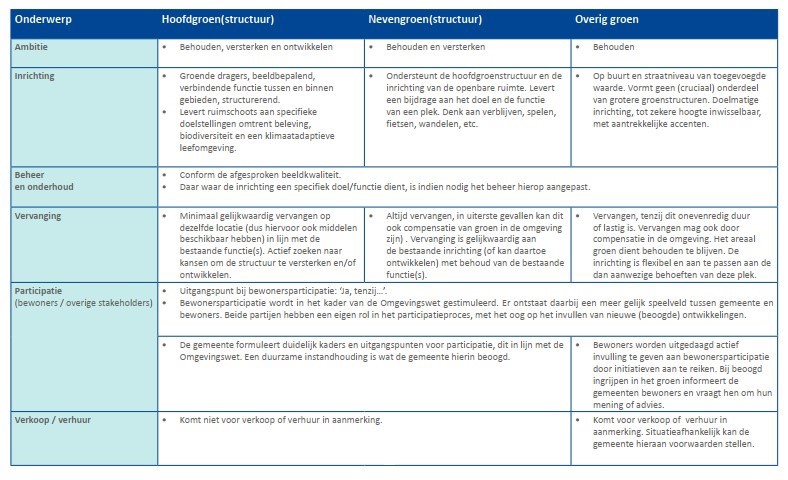 Hieronder zijn de voornaamste consequenties voor het beleid voor de groenstructuren van deze aanpak nog een keer in tabel vorm weergegeven. Deze tabel is ook terug te vinden op pag. 15 in de bijlage. Waar de tekst in de tabel verschilt van die in dit document geldt de tekst in dit document.