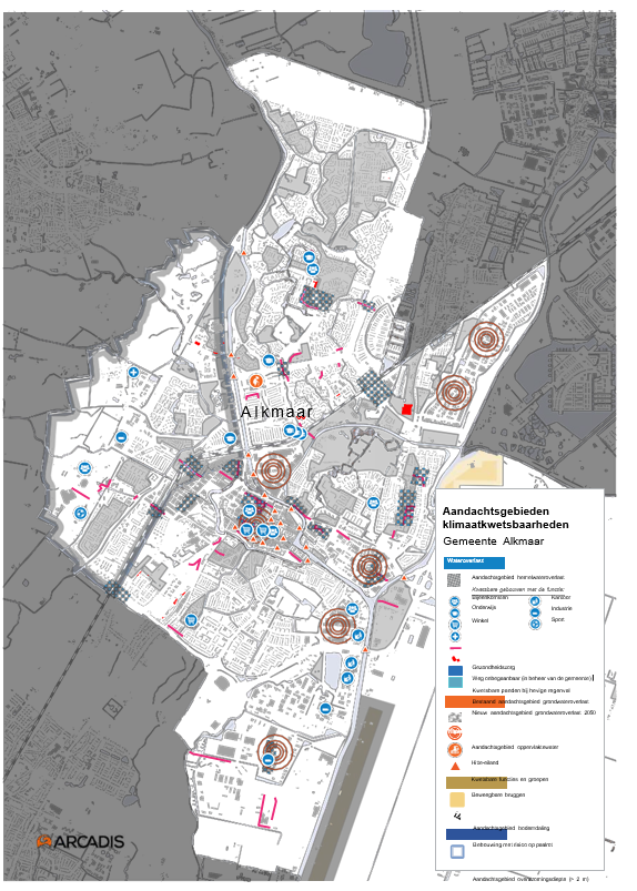 In 2019 is de stresstest voor de gemeente Alkmaar opgesteld [12]. Hierin zijn de kwetsbaarheden op gemeenteschaal in kaart gebracht voor de vier klimaateffecten; wateroverlast, hitte, droogte en overstromingen. Dit is gedaan met behulp van de gegevens uit de Klimaateffectatlas en de Klimaatatlas van Hoogheemraadschap Hollands Noorderkwartier (HHNK). Hierbij zijn ook de natuurlijke fysische omstandigheden meegenomen, zoals bodemtype en -opbouw en de geomorfologie (stuwwal, droogmakerij, zeekleiafzetting etc.). De resultaten zijn opgenomen in onderstaande paragrafen en op de kaart in bijlage I.