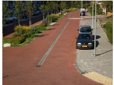 Bij de herinrichting van de wijk De Hoef is ingezet op het vasthouden en infiltreren van hemelwater om de wijk waterrobuust te maken. Het is een ruim opgezette jaren 70-wijk op een ophooglaag van zand. Er is gebruik gemaakt van deze natuurlijke omstandigheden om meer water te infiltreren en vast te houden. Hiervoor zijn wadi’s aangelegd in de groengebieden tussen de flats en langs de straten zijn raingardens en infiltratiestroken aangelegd (zie figuur 2). Door dit waterrobuuste systeem, gebruikmakend van de natuurlijke omstandigheden, geeft water minder overlast, wordt het langer vastgehouden en is de wijk kolkloos.