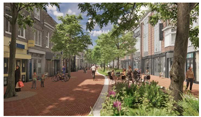 De winkelstraat de Laat in het centrum van Alkmaar had mede door de vele verharding en beperkte hoeveelheid groen te maken met wateroverlast en hittestress. Met het herinrichtingsplan (zie figuur 3) dat voorziet in een toename van de hoeveelheid groen en meer hemelwaterafvoer door een extra hemel- waterleiding, worden deze overlastsituaties beperkt. De leefbaarheid wordt vergroot en het gebied wordt aantrekkelijker voor de gebruikers.