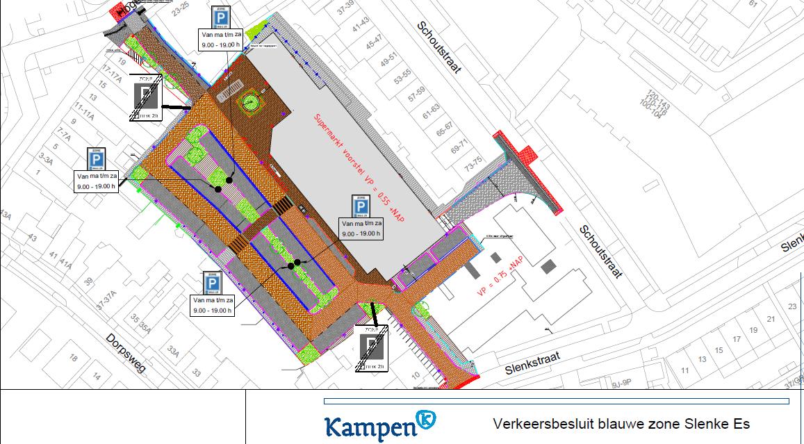 - door middel van het plaatsen van de verkeersborden E10 (parkeerschijfzone) en E11 (einde parkeerschijfzone) van bijlage 1 van het RVV 1990 en onderbord met de tekst ‘2h van 7:00 – 21:00 h maandag t/m zaterdag’ op het parkeerterrein Slenkstraat, 51 parkeerplaatsen aan te wijzen als onderdeel van een parkeerschijfzone;