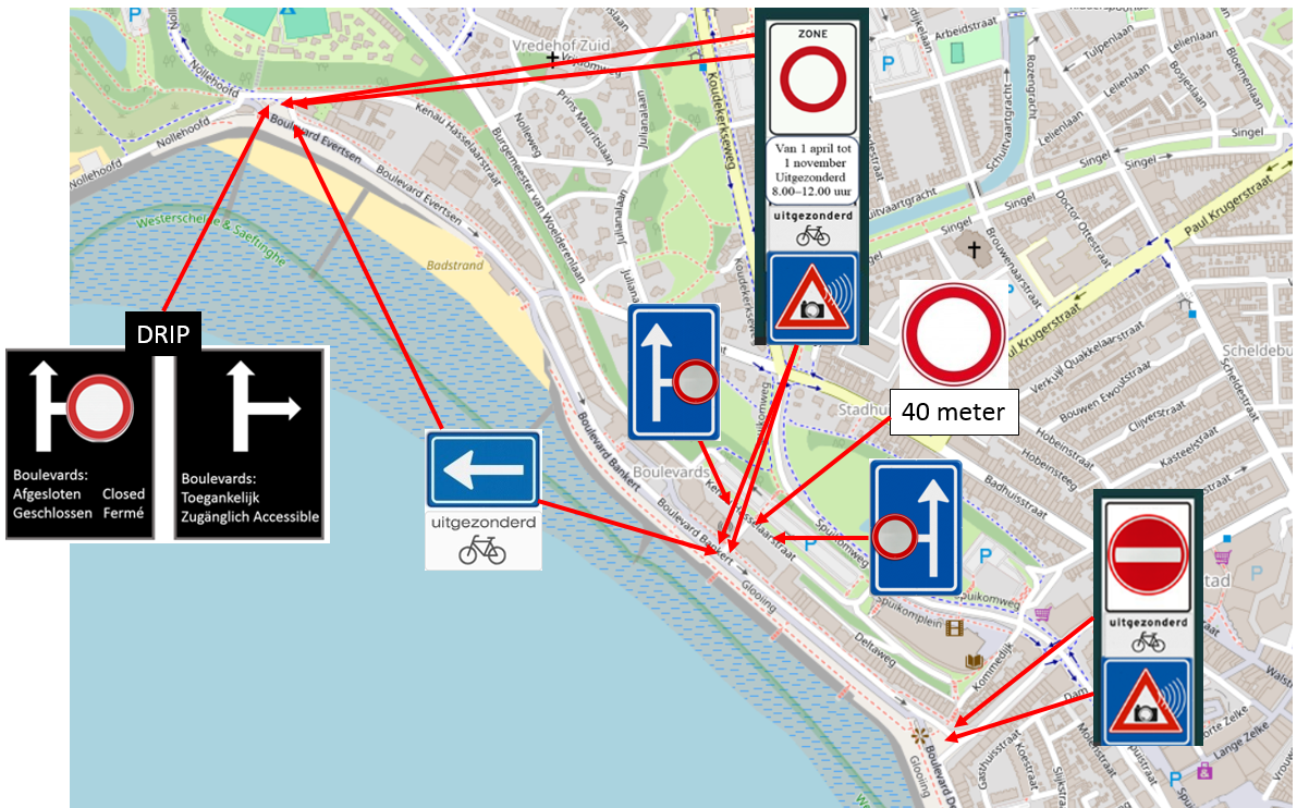 - Op de Boulevards Evertsen en Bankert is in 2022 en 2023 reeds een sluitingsregime voor gemotoriseerd verkeer beproefd van 1 april tot en met 31 oktober in de weekenden en op feestdagen tussen 12:00 en 24:00 uur en in juli en augustus dagelijks tussen 12:00 en 24:00 uur;