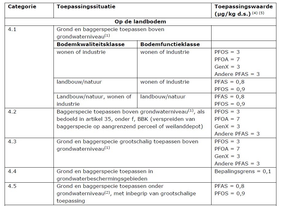 Figuur 2.1 Tijdelijke toepassingsnormen voor PFAS op landbodem (bron: THK van 28 november 2019)
