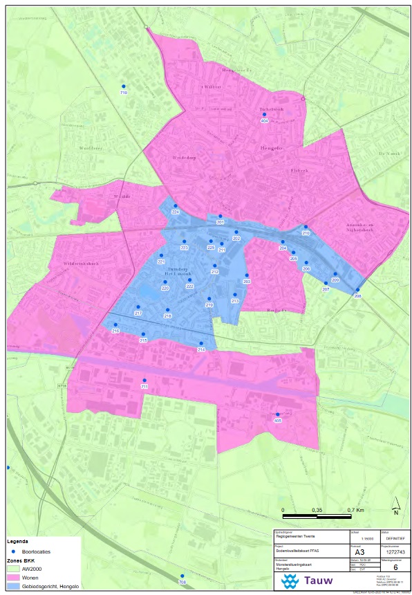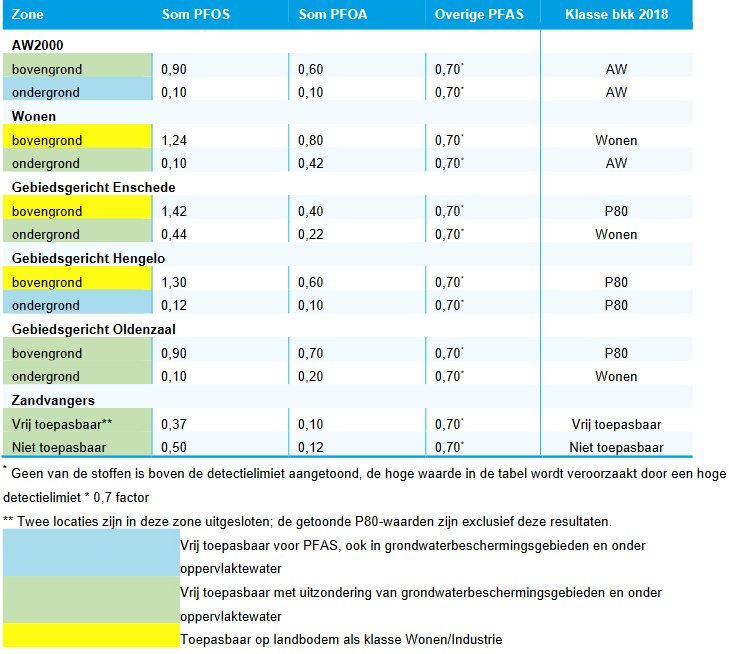 In de bovengrond van de gebiedsgerichte zones Hengelo en Enschede en de zone Wonen overschrijdt de P80 van de som PFOS de voorlopige achtergrondwaarde (0,9 µg/kg d.s.). De som PFOA overschrijdt nergens de voorlopige achtergrondwaarde (0,8 µg/kg d.s.). In de ondergrond wordt de voorlopige tijdelijke achtergrondwaarde voor geen enkele parameter overschreden en voldoet de P80 van de ondergrond in de zone AW2000, en de gebiedsgerichte zone Hengelo zelfs aan de strengste toepassingsnorm van 0,1 µg/kg d.s.